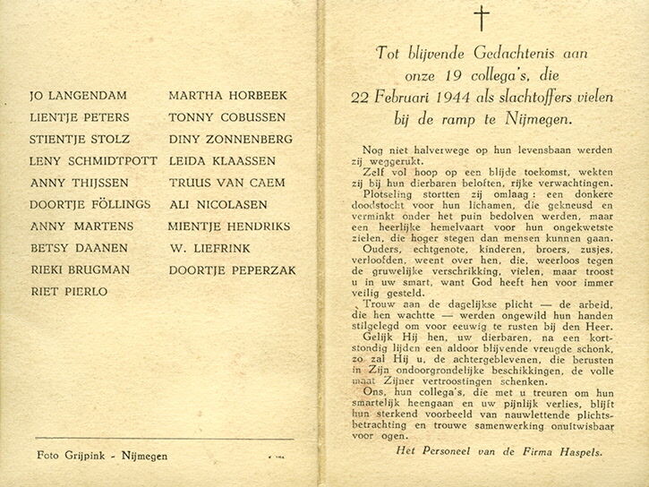 Op 22 februari 1944 kreeg modehuis Haspels aan de Burchtstraat tijdens het Amerikaanse bombadement een voltreffer. 19 Medewerkers kwamen daarbij om. Dit is het bidprentje dat hen herdenkt.