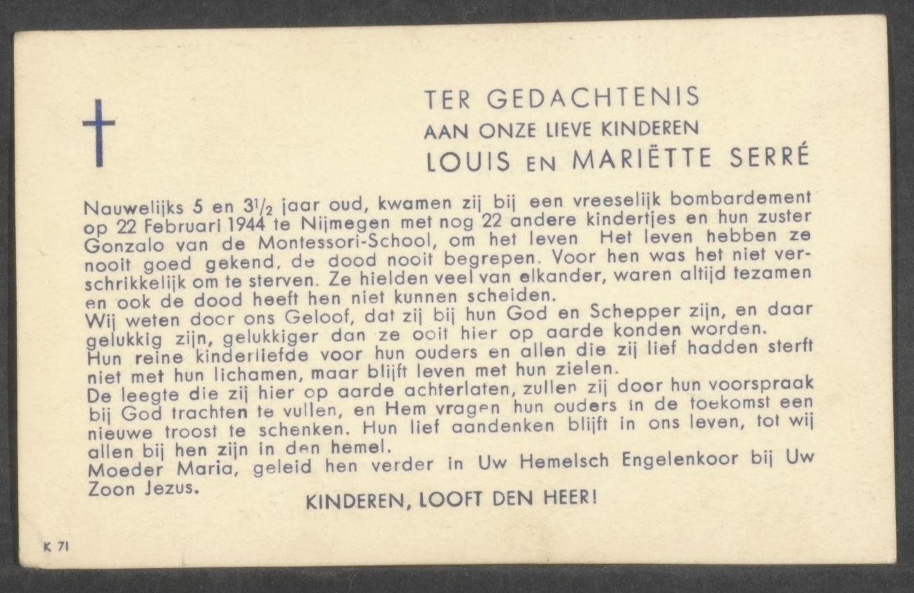Op 22 februari 1944, tijdens het Amerikaanse bombardement op Nijmegen, viel er een bom op de Montessori kleuterschool aan de Lange Burchtschool. 24 Kinderen en 8 zusters kwamen daarbij om het leven. Louis en Mariëtte Serré, broertje en zusje, waren twee van hen.
